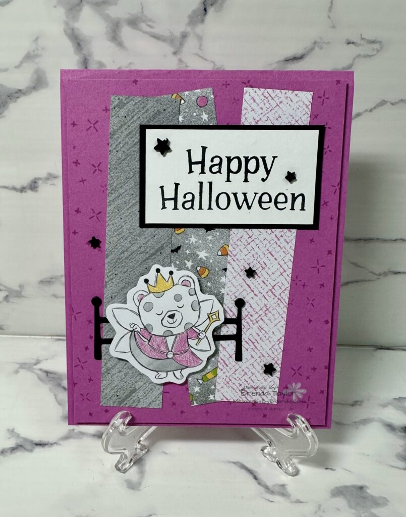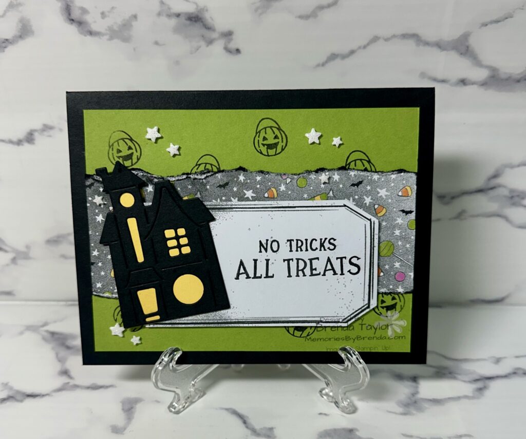 The base of the is Basic Black followed by a layer of Granny Apple Green. I stamped the pumpkin treat bags in Memento Black ink. I had a strip of the designer series paper 2 1/2” wide by 5” long, I torn each long side of it and then used the ink pad to add Black ink to the edges. I die cut the haunted house out of Basic Black card stock and then I add a two scrap piece of Darling Duck to make the “lights shine through”. The tag is from the designer series paper as well. Stamp the saying in Memento Black ink and then add the foam stars.