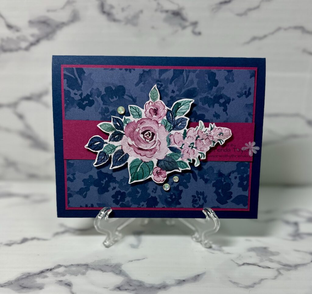 The base of the card is Night of Navy followed by Berry Burst and then a piece of designer series paper and a wide band of Berry Burst card stock. I cut the main image out of the designer series paper. Considering I am not a fan of fussy cutting, this was not too difficult. I used dimensionals on the flowers and I put Wink of Stella over the flowers and leaves. Finally added some holographic gems.